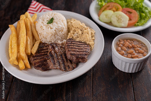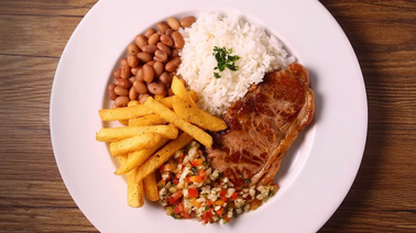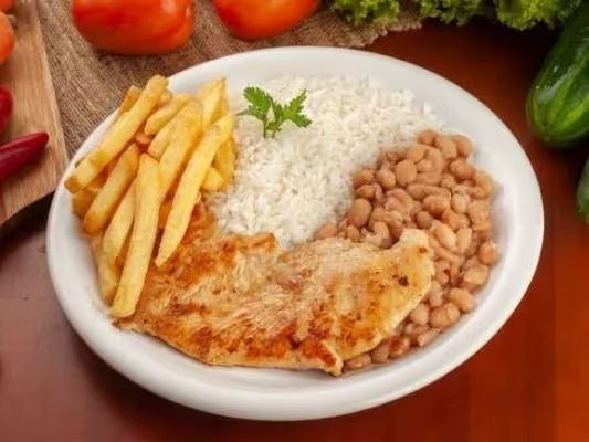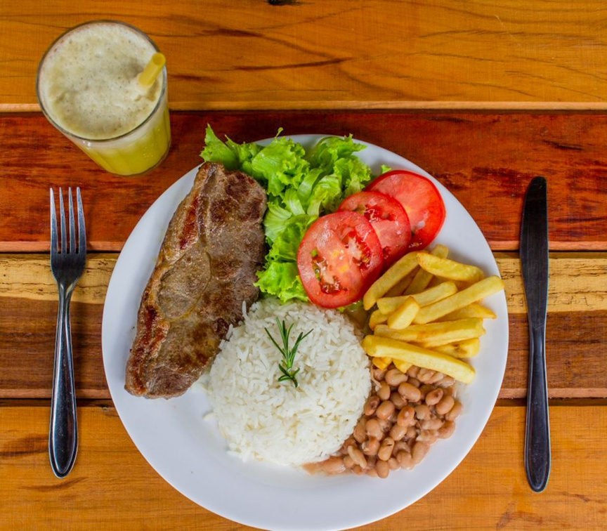 Acompanha arroz, feijão, fritas, farofa, vinagrete e molho da casa