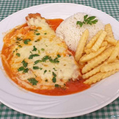 Filé de frango a milanesa, com molho e mussarela gratinada