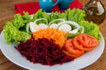 Salada de alface, tomate, cenoura ralada, beterraba ralada, cebola e palmito