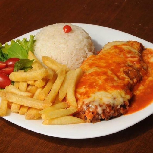 Filé mignon a milanesa, com molho e mussarela gratinada